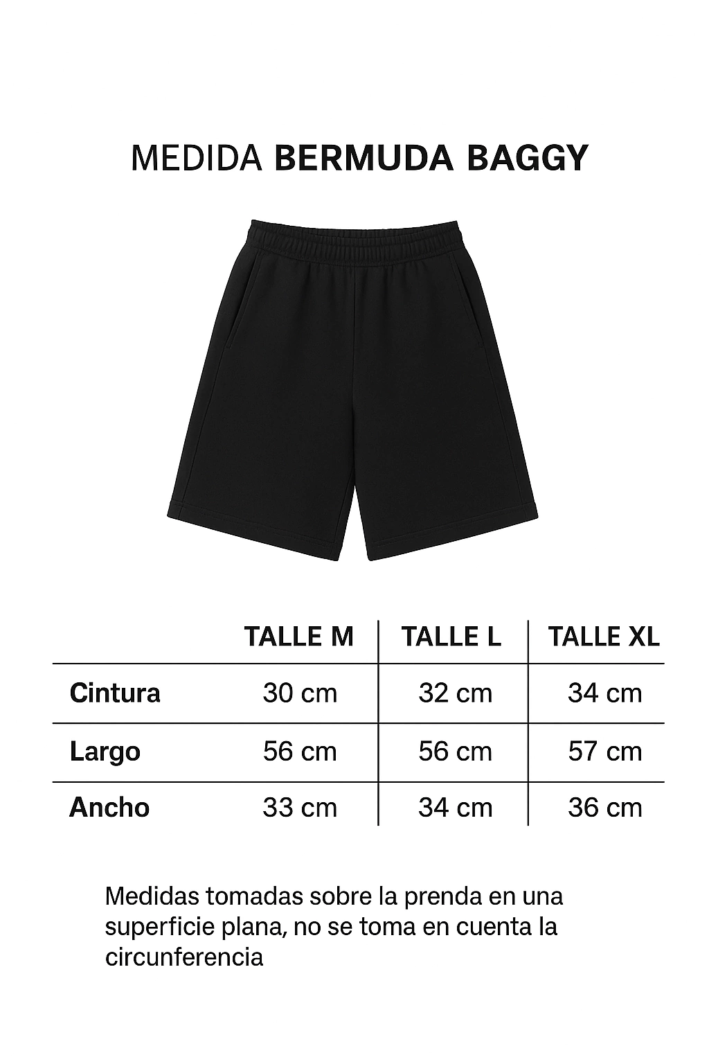 Medidas tomadas sobre la prenda en una superficie plana, no se toma en cuenta la circunferencia. Tener en cuenta que en la cintura no se estiró el elástico.